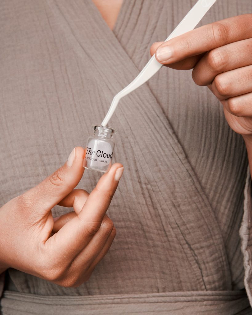 Een belangrijk onderdeel van The Routine is The Cloud: 99% pure collageen. Je brengt The Cloud aan op je gezicht waar het nodig is, bijvoorbeeld op het voorhoofd. The Cloud wordt door de huid opgenomen en vult de collageenniveaus aan.